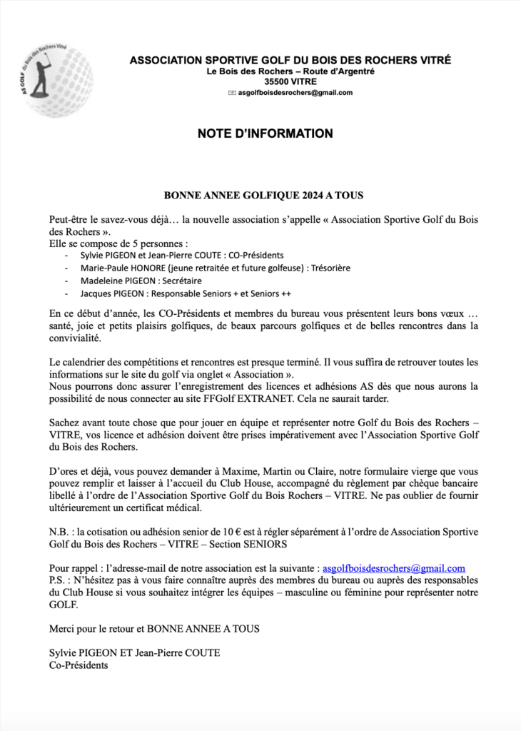 Pour débuter cette nouvelle année, je vous invite à prendre connaissance de la note d’information ci-dessous, communiquée par l’Association Sportive Golf du Bois des Rochers Vitré.